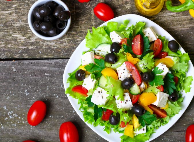 Wallpaper Greek, cooking, recipe, lettuce, tomatoes, paprika, olives, feta, 4k, Food