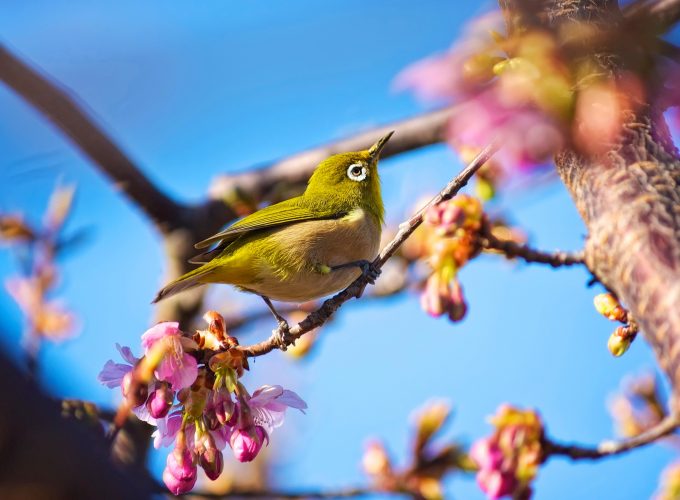 Wallpaper Japanese bird, White Eye, nature, flowers, spring, blue sky, sakura, Animals