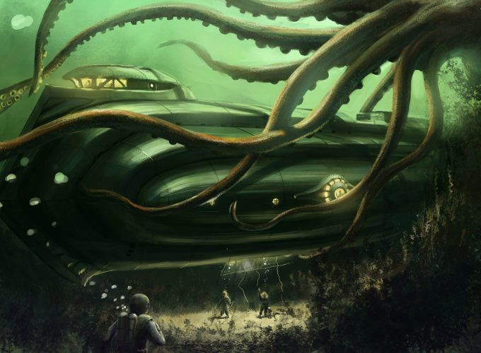Wallpaper Octopus, Nautilus, Jules Verne, bottom, ocean, boat. Underwater, ocean, sea, water, art, green, Animals